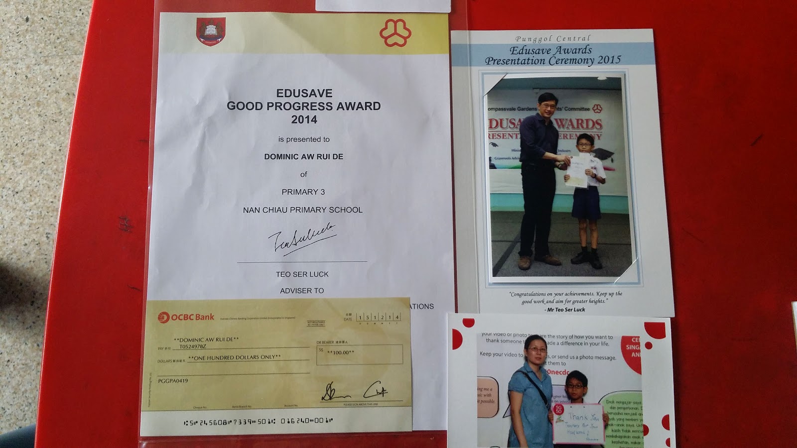 dom managed to do very well last year and is again awarded as the top 30% of his cohort in his pri school. he was also given the same award for p1 and p2 by the sengkang pungol grassroot community. what was unexpected was that he was invited to the EduSave ceremony to be presented with the cert by the MP.